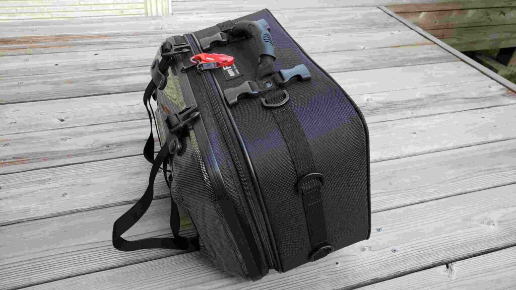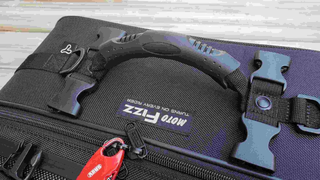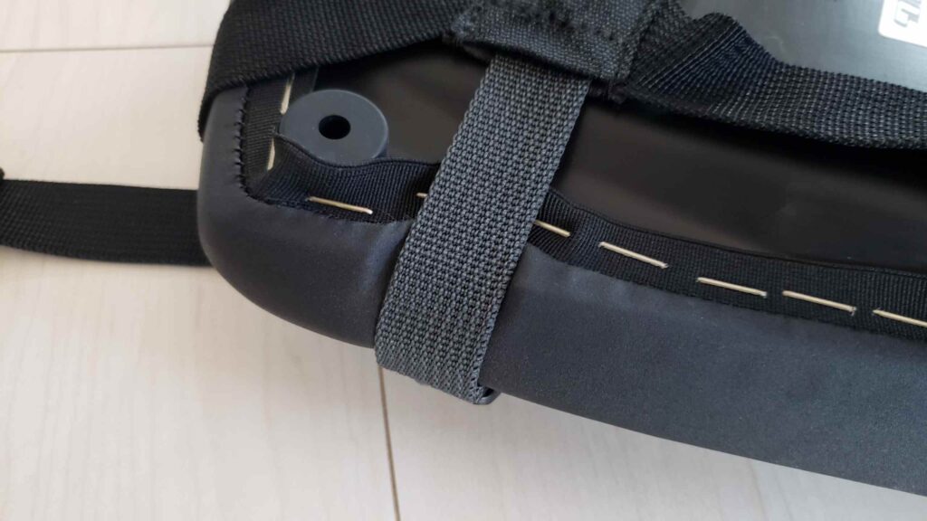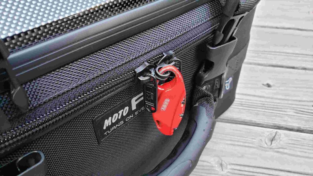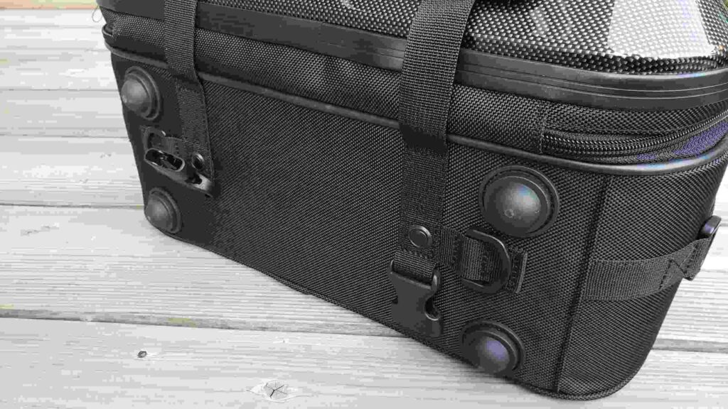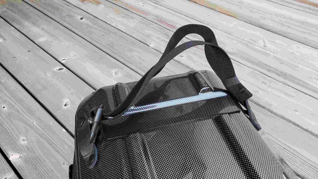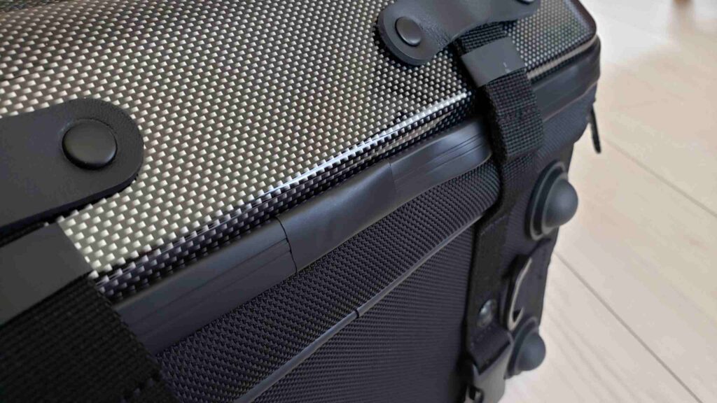 カーボン柄の蓋の上には荷物を乗せて固定できるベルトが付属。プラスチックバックル仕様でそのベルトの長さが調整可能で大きな荷物から小さな荷物まで対応し、通常使いの時もプラスチックバックルが蓋ロックの役割も兼ね、ジッパーとダブルでロック出来るようになっています。