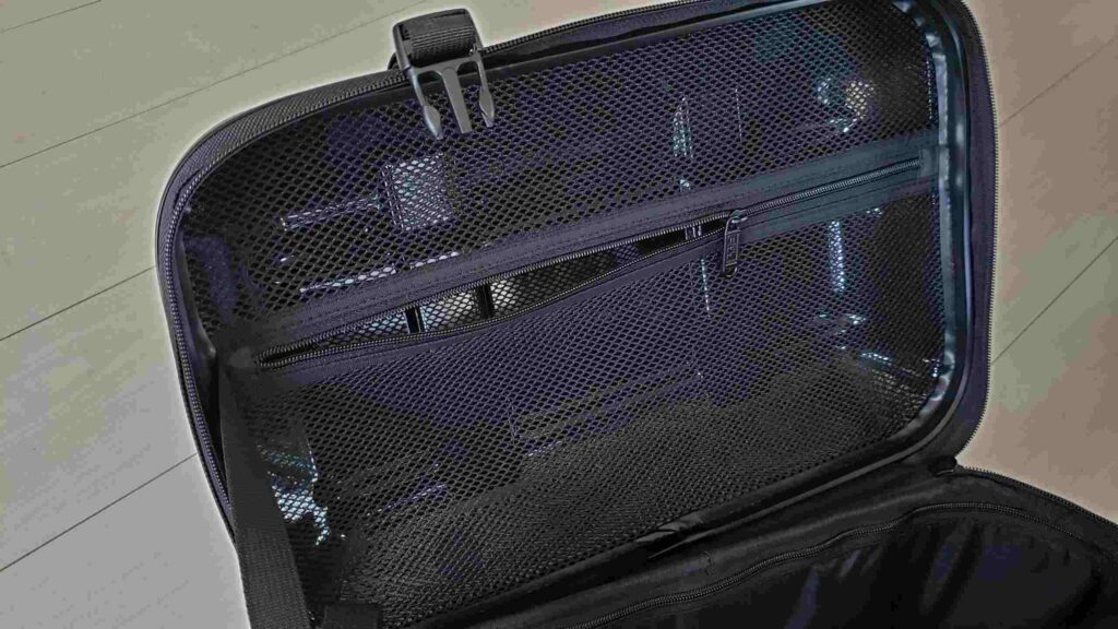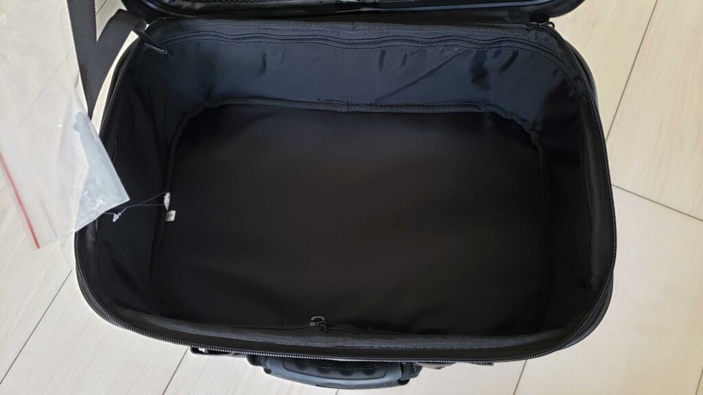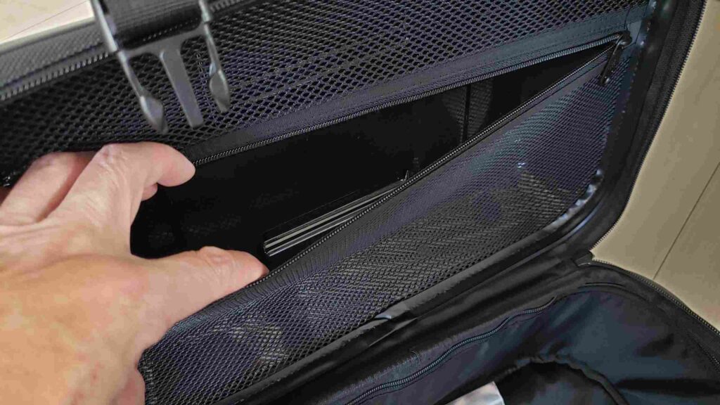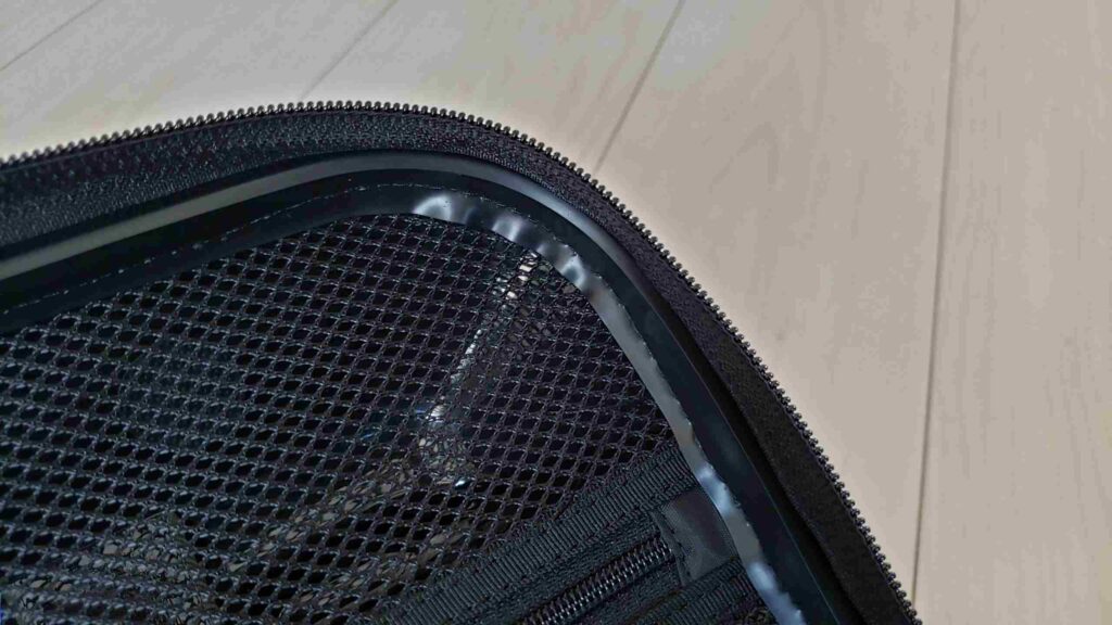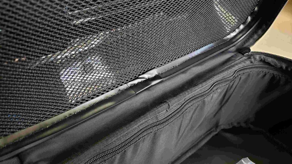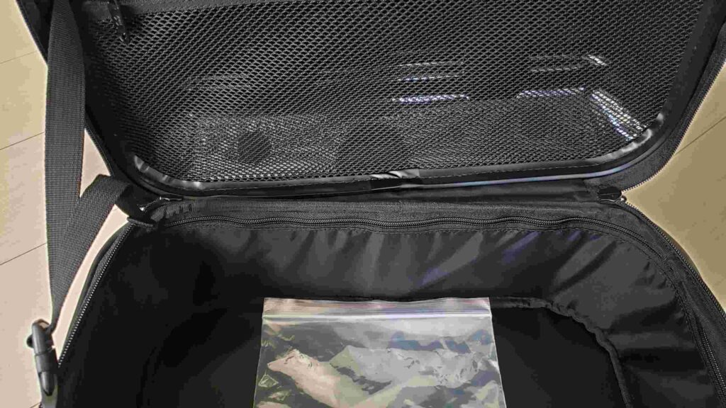 蓋の裏にはメッシュのジッパー付き仕切りがあり、蓋の裏を効率的に使えるのはとても便利です