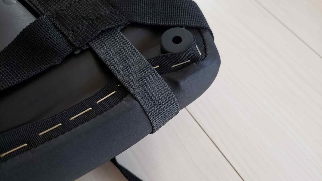 シートに乗せる底にあたる部分は滑り止めのゴム質素材。サイドに底足があるのはこのゴム質素材は粘着性があり、シートの上では滑り止めの役目をしますが、取り外した状態で滑り止め面を下にするとゴミの付着に繋がるのでサイドに底足があるのでしょう。