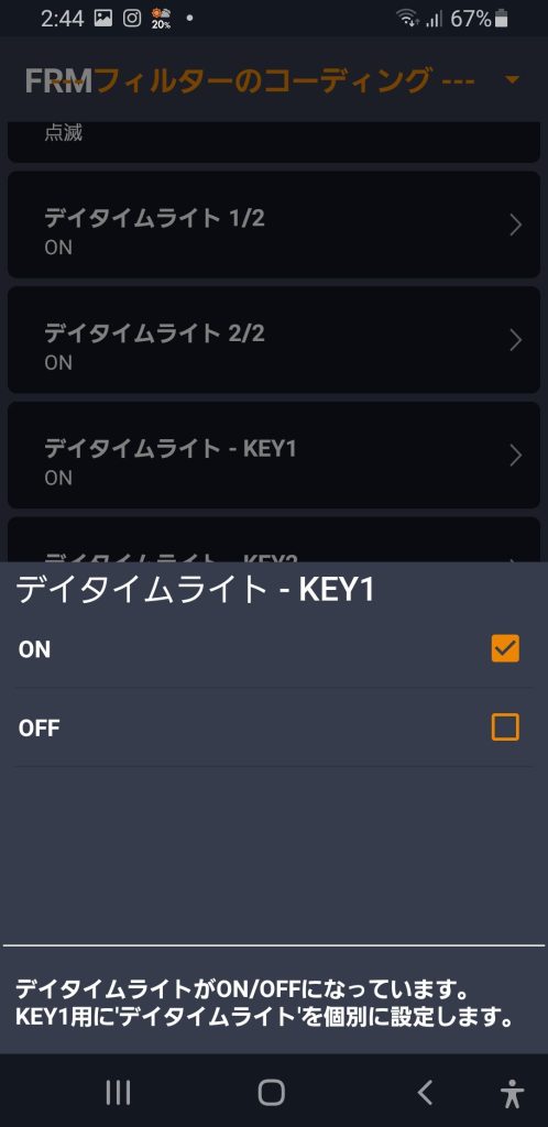 デイタイムライトーKEY1と2はデフォルトで付いている2つある各キー個別の設定を可能にするもので、BMWの2つあるキーはキーと車両の情報が紐づいていてそれぞれの設定項目が各キーによって設定ができ、燃費の計算等も使うキーで変わります。