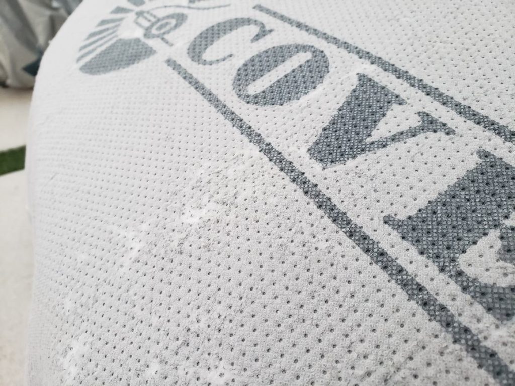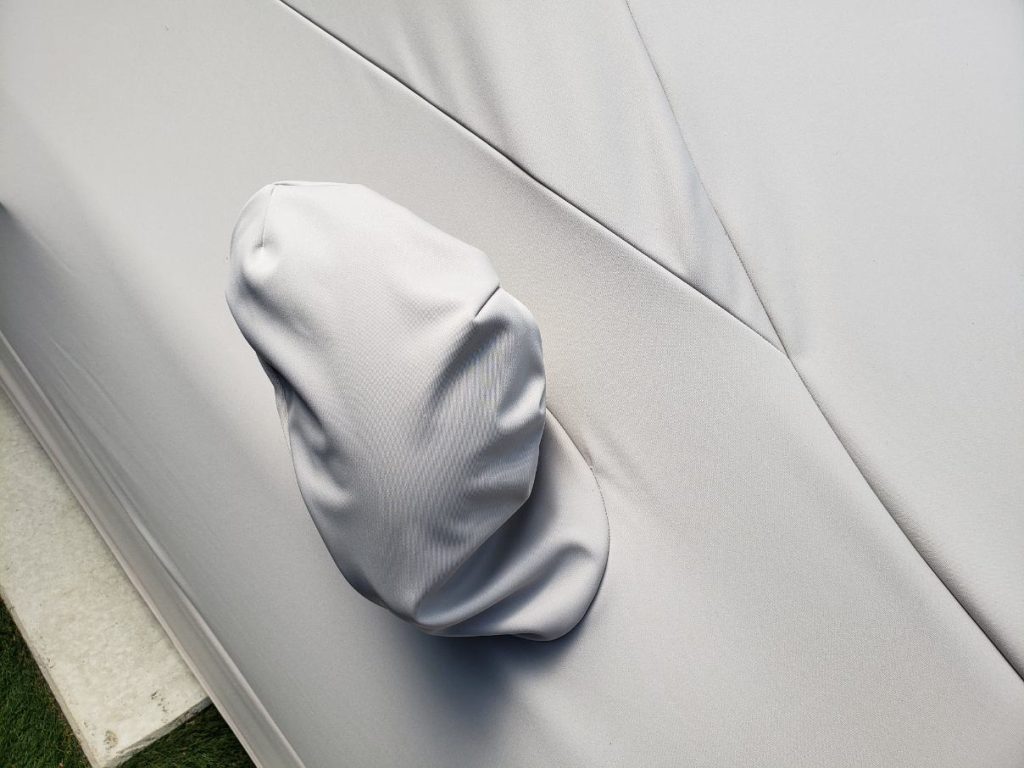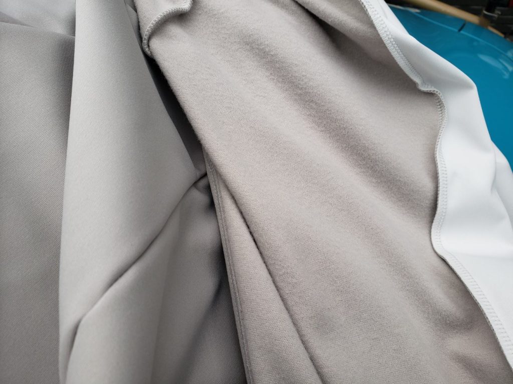 タイヤの中心からやや下からは切り返しで素材が違う。やや起毛素材でカバー部よりストレッチが強く本体の下に回り込んで車をガッチリとホールドする作りになり、一番のウィークポイントはこの生地と上部の2つの生地からなる切り返しの部分だと思う。