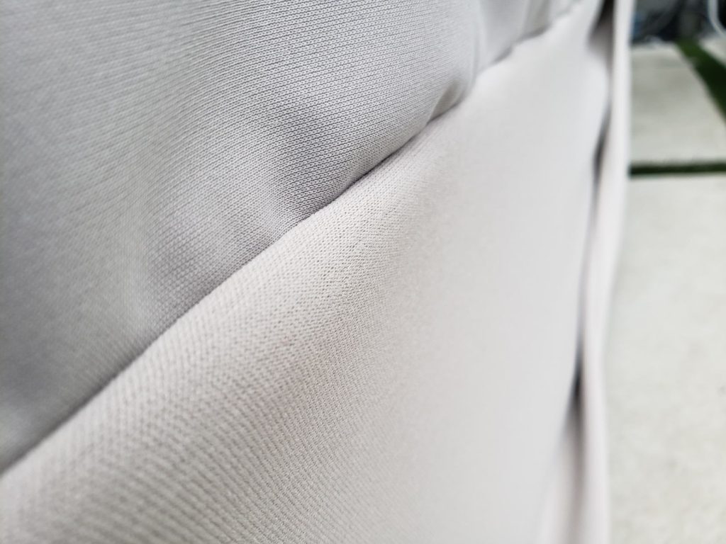 屋外用の生地は一択でありストレッチの効いたスベスベした素材である。裏側は表現が難しいが細かな凹凸のある特殊なすりガラスの様な風合いで、特別に用意されていると言う。この生地の価格が高いのだろう。