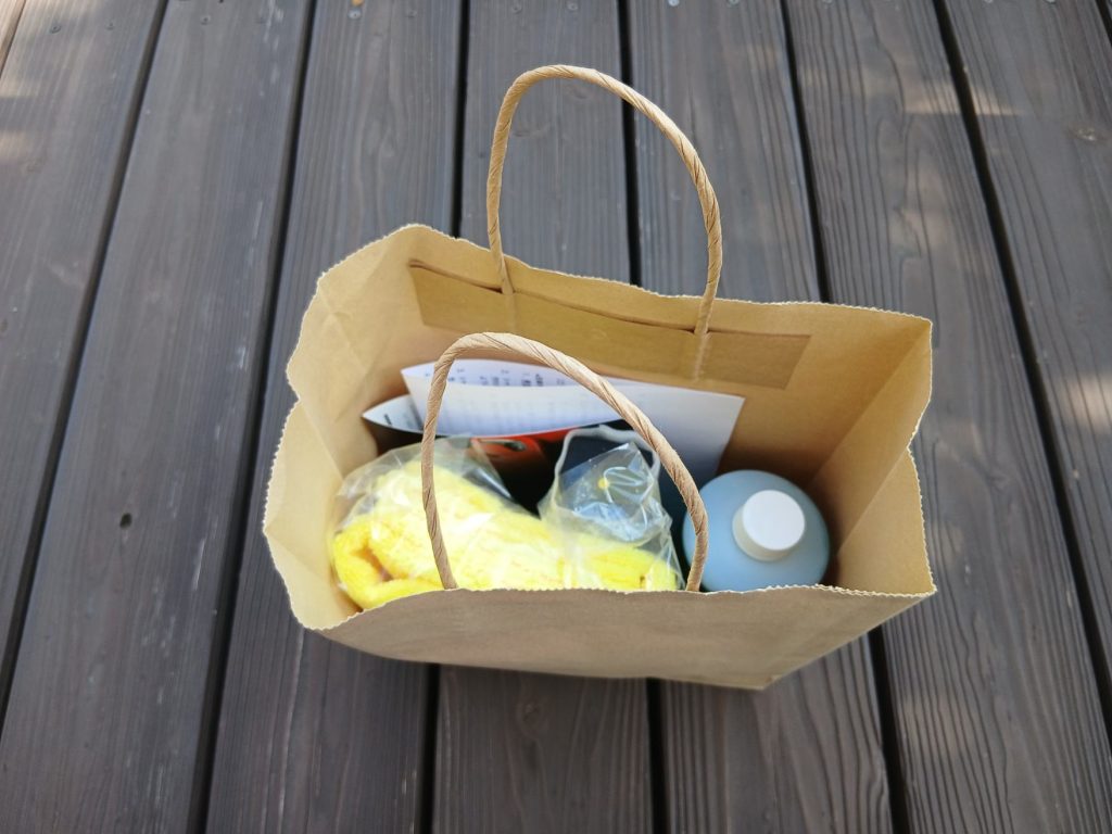 紙バッグに入れられた付属のシャンプーと撥水剤セット